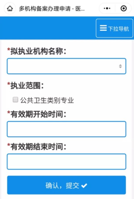 4、然后填寫業(yè)務(wù)信息,擬執(zhí)業(yè)機(jī)構(gòu)名稱、執(zhí)業(yè)范圍、有效期開始時(shí)間和有效期結(jié)束時(shí)間。填寫完成后,點(diǎn)擊“確認(rèn),提交”