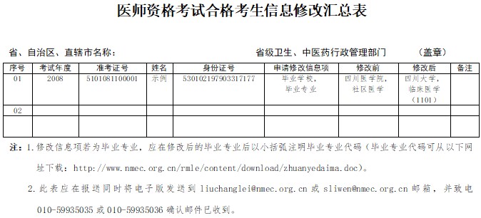二、修改醫(yī)師資格信息,由申請人填寫《醫(yī)師資格考試合格考生信息修改審核表》并提交有關材料,向考試報名所在考點的衛(wèi)生、中醫(yī)藥行政管理部門提出申請。