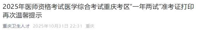 重慶考區(qū)2025年臨床執(zhí)業(yè)醫(yī)師“一年兩試”準(zhǔn)考證打印已開始!