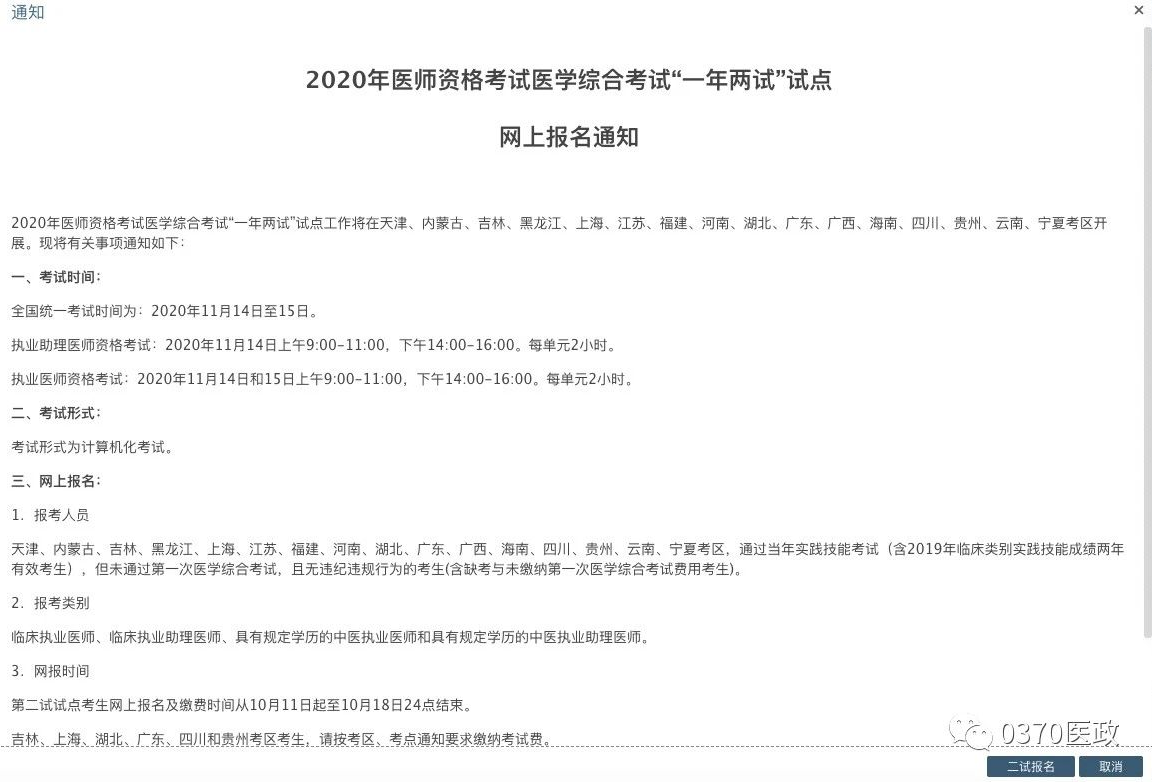 全國2020年醫(yī)師資格考試一年兩試試點報名及繳費時間通知匯總