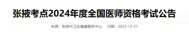 為做好2024年度全國醫(yī)師資格考試工作,根據(jù)國家衛(wèi)生健康委員會《醫(yī)師資格考試委員會公告》和省衛(wèi)生健康委《甘肅考區(qū)2024年度全國醫(yī)師資格考試公告》要求,現(xiàn)將張掖考點考試報名工作公告如下: