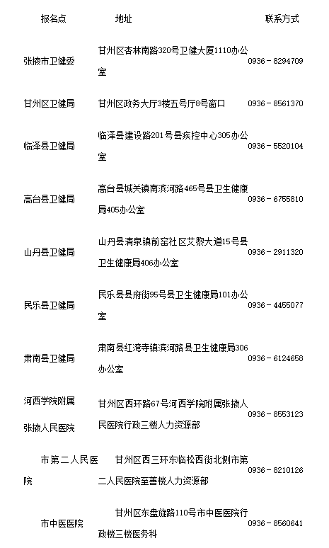張掖考點下設(shè)市衛(wèi)生健康委、甘州區(qū)、臨澤縣、高臺縣、山丹縣、民樂縣、肅南縣衛(wèi)生健康局及河西學(xué)院附屬張掖人民醫(yī)院、市第二人民醫(yī)院、市中醫(yī)醫(yī)院10個報名點。各報名點具體負責(zé)考試報名現(xiàn)場確認、相關(guān)證明材料收集審核等工作。市疾控中心、市婦幼保健院、市中心血站及軍隊考生的報名工作由市衛(wèi)生健康委負責(zé);河西學(xué)院附屬張掖人民醫(yī)院負責(zé)本院及河西學(xué)院醫(yī)學(xué)院、河西學(xué)院第二附屬人民醫(yī)院考生報名;各縣區(qū)分別負責(zé)轄區(qū)范圍內(nèi)公立、私立醫(yī)療機構(gòu)考生報名。
