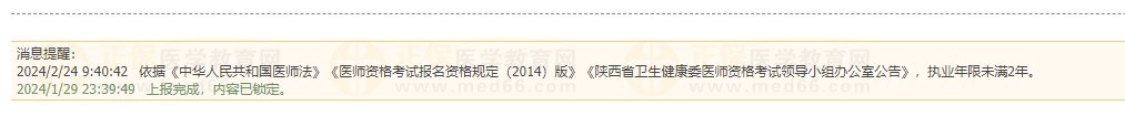 2、例如陜西西安,會(huì)在“上傳相關(guān)資料”處提醒顯示審核結(jié)果。如果是因年限、專(zhuān)業(yè)等問(wèn)題審核未通過(guò),無(wú)需再次提交材料,無(wú)法報(bào)考2024年醫(yī)師資格考試。如果是資料有問(wèn)題,請(qǐng)及時(shí)更新替換。