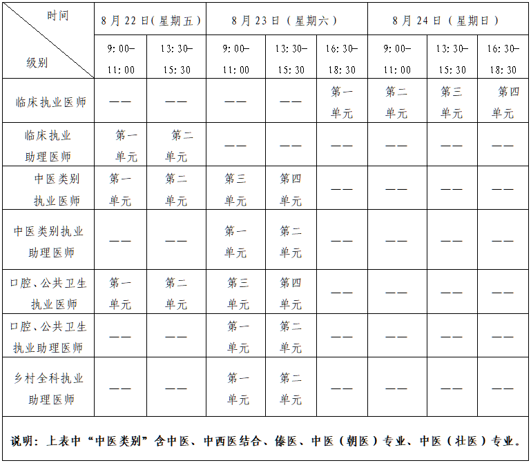 考試實行計算機化考試,軍隊現(xiàn)役人員加試軍事醫(yī)學(xué)、院前急救崗位和兒科專業(yè)加試相應(yīng)內(nèi)容。統(tǒng)一考試時間如下: