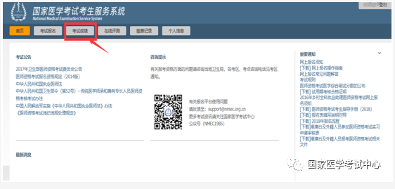 考生登錄國家醫(yī)學(xué)考試考生服務(wù)系統(tǒng)后,點擊考試成績菜單即可。