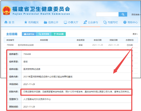 近期有學(xué)員在福建衛(wèi)健委網(wǎng)站上提問:2021年醫(yī)師資格筆試成績(jī)什么時(shí)候才能出結(jié)果和查詢?官方的回復(fù)如下: