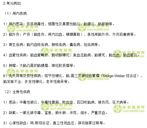 4)代謝、營養(yǎng)及內(nèi)分泌疾?。旱脱牵òㄒ葝u素過量、胰島細胞瘤及饑餓性低血糖等)、蛋白質(zhì)及氨基酸代謝異常、低血鈣、低血鎂、維生素B6缺乏(吡哆醇依賴癥)、水電解質(zhì)與酸堿平衡紊亂、尿毒癥、糖尿病性酸中毒。