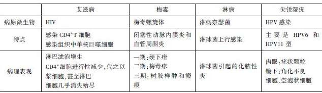 艾滋病主要通過感染CD4+T細胞而致病;而梅毒主要侵犯的是閉塞性動脈內(nèi)膜炎和血管周圍炎;淋病是通過淋球菌的上行感染而導(dǎo)致的化膿性炎癥;尖銳濕疣是通過HPV感染而產(chǎn)生的空泡狀細胞。