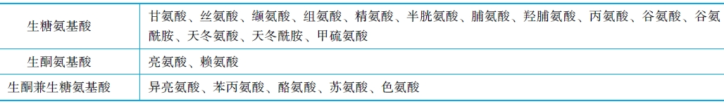 (2)轉(zhuǎn)變?yōu)樘呛椭?α-酮酸可轉(zhuǎn)變?yōu)樘呛椭尽>挺?酮酸的氨基酸來源講,大多數(shù)氨基酸在體內(nèi)可生成糖,這些氨基酸稱為生糖氨基酸;亮氨酸在體內(nèi)可生成酮體,稱為生酮氨基酸;苯丙氨酸、酪氨酸、色氨酸及異亮氨酸既可生成糖、又可生成酮體,稱為生糖兼生酮氨基酸。