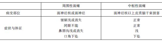 (2)面癱:系指面神經(jīng)麻痹所致的面部肌肉癱瘓。根據(jù)病變部位和臨床表現(xiàn),可分周圍性和中樞性兩型,前者病變位于面神經(jīng)核或面神經(jīng),后者則位于面神經(jīng)核以上的皮質(zhì)延髓束。兩者臨床表現(xiàn)區(qū)別見表。