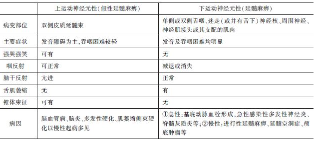 (3)延髓麻痹:系指咽部肌肉癱瘓所引起的吞咽困難、言語障礙綜合征,因常有舌及唇的麻痹,故亦稱唇-舌-咽麻痹,多為舌咽、迷走及舌下神經(jīng)損害所致,由于這些顱神經(jīng)的核位于延髓,故通常稱延髓麻痹或球麻痹,可伴有三叉神經(jīng)運(yùn)動支及面肌麻痹。延髓麻痹亦可分上、下運(yùn)動神經(jīng)元性兩種。