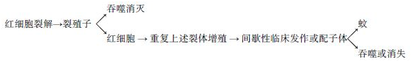 (1)紅細(xì)胞外期:子孢子→肝細(xì)胞→裂殖子→被吞噬消滅或入血→紅細(xì)胞速發(fā)型子孢子引起瘧疾急性發(fā)作,而瘧疾遠(yuǎn)期復(fù)發(fā)則與遲發(fā)型子孢子有關(guān)。