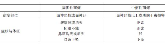 (2)面癱:系指面神經(jīng)麻痹所致的面部肌肉癱瘓。根據(jù)病變部位和臨床表現(xiàn),可分周圍性和中樞性兩型,前者病變位于面神經(jīng)核或面神經(jīng),后者則位于面神經(jīng)核以上的皮質(zhì)延髓束。兩者臨床表現(xiàn)區(qū)別見表。