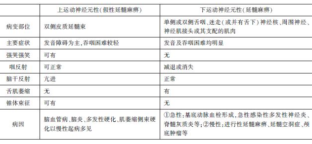 (3)延髓麻痹:系指咽部肌肉癱瘓所引起的吞咽困難、言語(yǔ)障礙綜合征,因常有舌及唇的麻痹,故亦稱唇-舌-咽麻痹,多為舌咽、迷走及舌下神經(jīng)損害所致,由于這些顱神經(jīng)的核位于延髓,故通常稱延髓麻痹或球麻痹,可伴有三叉神經(jīng)運(yùn)動(dòng)支及面肌麻痹。延髓麻痹亦可分上、下運(yùn)動(dòng)神經(jīng)元性兩種。