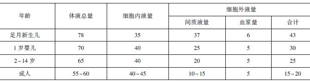 在嬰兒期,其體液總量(L)=0.7(70%)×體重(kg),細胞內(nèi)液最(L)=0.4(40%)×體重(kg),細胞外液量(L)=0.3(30%)×體重(kg)。