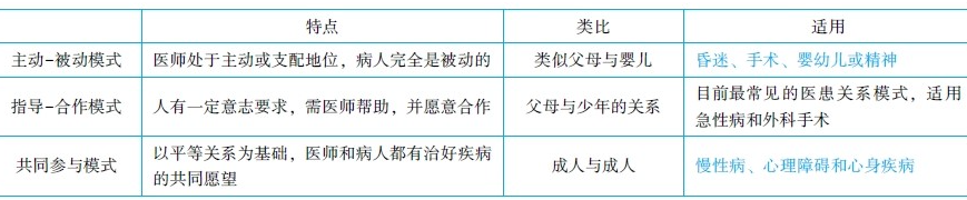 醫(yī)患關(guān)系的三種模式:主動-被動模式、指導-合作模式、共同參與模式;