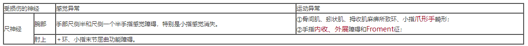 2.左腕掌側(cè)切割傷小指和環(huán)指尺側(cè)半感覺消失,F(xiàn)roment征陽性,可能損傷的神經(jīng)是