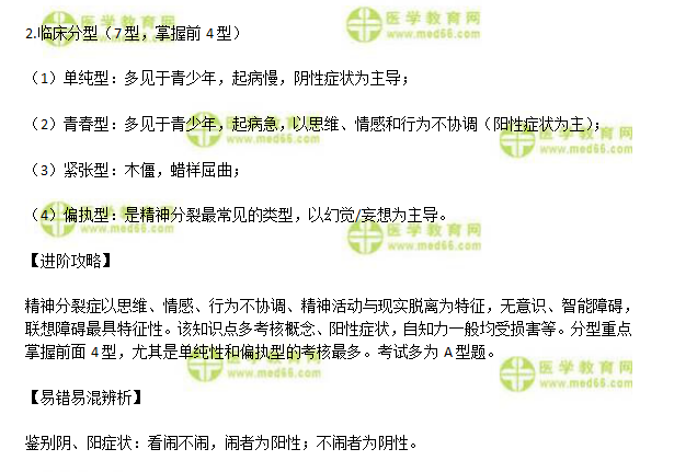 詳情關于2019年臨床助理“精神分裂癥病因、發(fā)病機制、臨床表現(xiàn)及分型”考點內(nèi)容,備考2019年臨床助理醫(yī)師考試的考生是否有掌握呢?為提高大家備考效率,在此醫(yī)學教育網(wǎng)小編整理了“精神分裂癥病因、發(fā)病機制、臨床表現(xiàn)及分型”知識點與試題供大家學習。內(nèi)容如下: