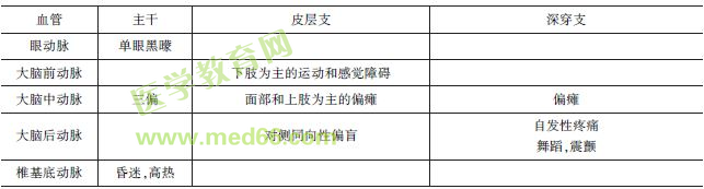 (3)大腦中動(dòng)脈:是最易發(fā)生閉塞的血管。主干閉塞出現(xiàn)對(duì)側(cè)偏癱、偏身感覺障礙和偏盲(三偏征);若累及優(yōu)勢(shì)半球,會(huì)出現(xiàn)失語、失讀等癥狀。皮質(zhì)支閉塞可出現(xiàn)對(duì)側(cè)面部和上肢為重的偏癱;累及優(yōu)勢(shì)半球,同時(shí)伴失語、失讀等癥狀;醫(yī)學(xué)|教育網(wǎng)累及非優(yōu)勢(shì)半球,可有偏側(cè)忽略等體像障礙。深穿支(豆紋動(dòng)脈)閉塞導(dǎo)致對(duì)側(cè)一致性偏癱,不伴偏身感覺障礙和偏盲。