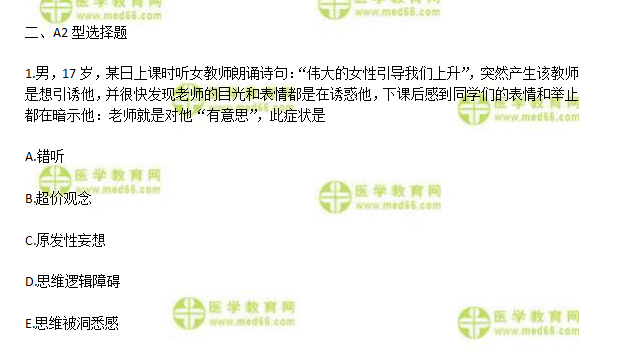 3.A【答案解析】此題分別考察考生對感知覺、思維、記憶障礙的癥狀鑒別。似曾相識屬于記憶障礙的癥狀之一,主要表現(xiàn)是對從未經(jīng)歷過的新事物有一種異常的熟悉感。與錯(cuò)認(rèn)在性質(zhì)上不同,錯(cuò)認(rèn)是把A事物看作為B事物,兩者不能在認(rèn)識的主體中共存。與幻覺在本質(zhì)上亦不同,后者是在缺乏任何客觀現(xiàn)實(shí)刺激的基礎(chǔ)上憑空產(chǎn)生的對某事物虛幻的知覺體驗(yàn)。被控制感實(shí)際上是一種思維體驗(yàn)而不是感知體驗(yàn),它指的是個(gè)體行動(dòng)的自主性喪失,完全由外力支配與擺布,非“我”性是鮮明的特征。言語運(yùn)動(dòng)性幻覺是一種特殊形式的幻覺癥狀,與聽幻覺的區(qū)別在于前者是一種本體感覺的障礙,后者是一種聽覺的障礙;前者感到自己像正在說話一樣,感到的是與言語相關(guān)的器官的運(yùn)動(dòng)而后者則強(qiáng)調(diào)在沒有客觀聲源的基礎(chǔ)上,患者聽到的內(nèi)容。