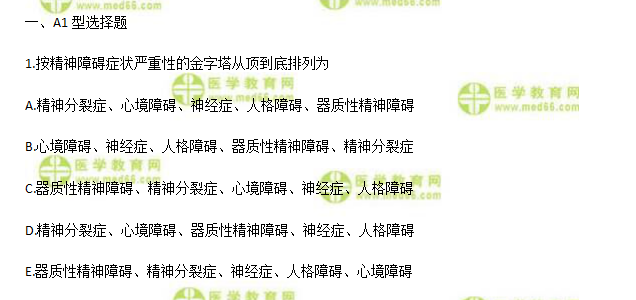1.C【答案解析】按精神障礙癥狀嚴(yán)重性的金字塔從頂?shù)降着帕袨椋浩髻|(zhì)性精神障礙、精神分裂癥、醫(yī)學(xué)|教育網(wǎng)心境障礙、神經(jīng)癥、人格障礙。