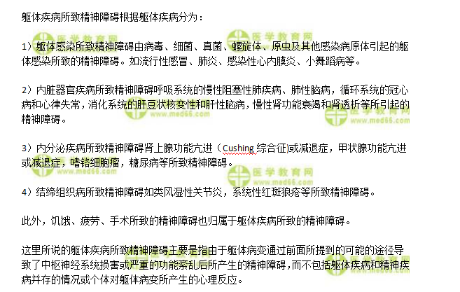(2)急性軀體疾病常引起意識(shí)障礙,慢性軀體疾病則引起智能障礙與人格改變。從急性期過渡到慢性期之間,可有抑郁、類躁狂發(fā)作、興奮、幻覺、妄想、木僵等癥狀。