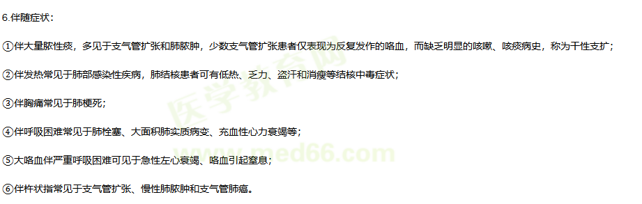 4.小量咯血為<100ml/d,中量咯血為100——500ml/d,大量咯血為>500ml/d或>300ml/次。