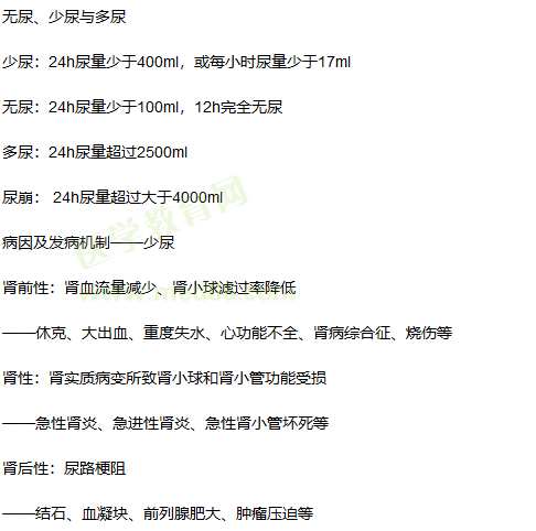 重點(diǎn)是掌握無(wú)尿、少尿與多尿各自的數(shù)值,一般題干多會(huì)告知患者是無(wú)尿、少尿與多尿所以此部分知識(shí)點(diǎn)還是比較簡(jiǎn)單的醫(yī)學(xué)|教育網(wǎng)。