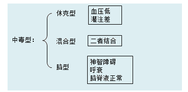 4.中毒型:腦型(神智障礙;呼衰)、休克型(血壓低,灌注差)、混合型。