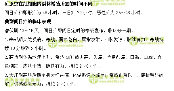 臨床特點(diǎn):間歇性定時(shí)發(fā)作的寒戰(zhàn)、高熱、繼以大汗而緩解,常有脾大與貧血。