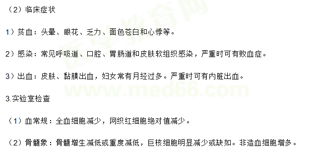(1)診斷:①全血細(xì)胞減少,網(wǎng)織紅細(xì)胞絕對(duì)值減少;②骨髓增生不良;③一般無(wú)肝、脾腫大;④除外其他導(dǎo)致全血細(xì)胞減少的疾病。