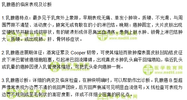 關(guān)于“臨床執(zhí)業(yè)助理醫(yī)師其他考點(diǎn):乳腺癌的臨床表現(xiàn)及診斷”相關(guān)內(nèi)容,相信參加臨床執(zhí)業(yè)助理醫(yī)師考試的考生都在關(guān)注,為方便大家了解,在此醫(yī)學(xué)教育網(wǎng)小編為大家整理如下內(nèi)容: