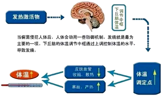 外源性致熱原→作用于粒細(xì)胞(中性和嗜酸性)和單核-巨噬細(xì)胞系統(tǒng)后→產(chǎn)生內(nèi)源性致熱原→作用于體溫調(diào)節(jié)中樞→皮膚血管收縮,散熱減少→骨骼肌周期性收縮,發(fā)生寒戰(zhàn),使產(chǎn)熱增加,結(jié)果使體溫上升。