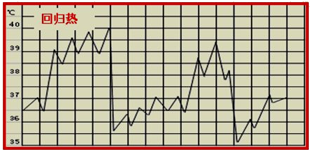 ⑤回歸熱:體溫驟升達(dá)39℃以上,持續(xù)數(shù)天后又驟降至正常水平,數(shù)天后又驟然升高,持續(xù)數(shù)天后又驟降,如此反復(fù)發(fā)作。