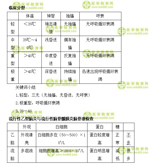 5.臨床表現(xiàn):高熱、抽搐和呼吸衰竭是乙腦極期的三大嚴(yán)重癥狀醫(yī)學(xué)|教育網(wǎng)。分型(輕,中,重,極重)