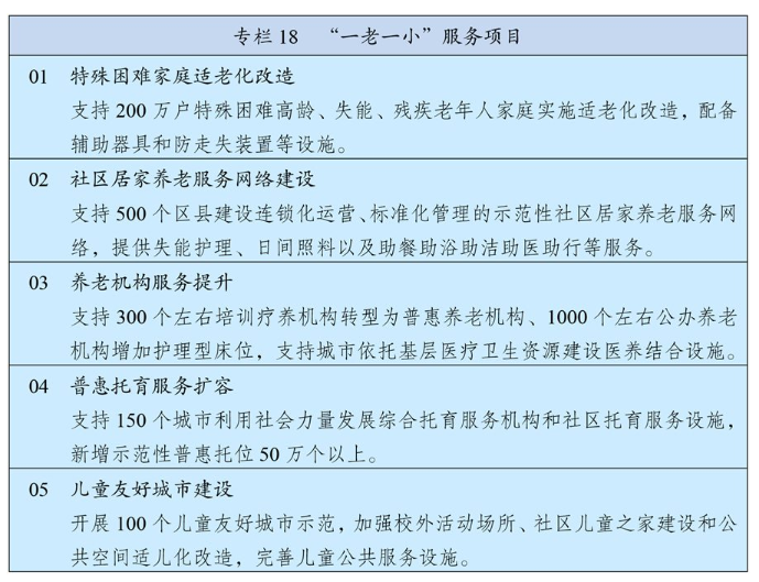 推動(dòng)養(yǎng)老事業(yè)和養(yǎng)老產(chǎn)業(yè)協(xié)同發(fā)展,健全基本養(yǎng)老服務(wù)體系,大力發(fā)展普惠型養(yǎng)老服務(wù),支持家庭承擔(dān)養(yǎng)老功能,構(gòu)建居家社區(qū)機(jī)構(gòu)相協(xié)調(diào)、醫(yī)養(yǎng)康養(yǎng)相結(jié)合的養(yǎng)老服務(wù)體系。完善社區(qū)居家養(yǎng)老服務(wù)網(wǎng)絡(luò),推進(jìn)公共設(shè)施適老化改造,推動(dòng)專業(yè)機(jī)構(gòu)服務(wù)向社區(qū)延伸,整合利用存量資源發(fā)展社區(qū)嵌入式養(yǎng)老。強(qiáng)化對(duì)失能、部分失能特困老年人的兜底保障,積極發(fā)展農(nóng)村互助幸福院等互助性養(yǎng)老。深化公辦養(yǎng)老機(jī)構(gòu)改革,提升服務(wù)能力和水平,完善公建民營管理機(jī)制,支持培訓(xùn)療養(yǎng)資源轉(zhuǎn)型發(fā)展養(yǎng)老,加強(qiáng)對(duì)護(hù)理型民辦養(yǎng)老機(jī)構(gòu)的政策扶持,開展普惠養(yǎng)老城企聯(lián)動(dòng)專項(xiàng)行動(dòng)。加強(qiáng)老年健康服務(wù),深入推進(jìn)醫(yī)養(yǎng)康養(yǎng)結(jié)合。加大養(yǎng)老護(hù)理型人才培養(yǎng)力度,擴(kuò)大養(yǎng)老機(jī)構(gòu)護(hù)理型床位供給,養(yǎng)老機(jī)構(gòu)護(hù)理型床位占比提高到55%,更好滿足高齡失能失智老年人護(hù)理服務(wù)需求。逐步提升老年人福利水平,完善經(jīng)濟(jì)困難高齡失能老年人補(bǔ)貼制度和特殊困難失能留守老年人探訪關(guān)愛制度。健全養(yǎng)老服務(wù)綜合監(jiān)管制度。構(gòu)建養(yǎng)老、孝老、敬老的社會(huì)環(huán)境,強(qiáng)化老年人權(quán)益保障。綜合考慮人均預(yù)期壽命提高、人口老齡化趨勢加快、受教育年限增加、勞動(dòng)力結(jié)構(gòu)變化等因素,按照小步調(diào)整、彈性實(shí)施、分類推進(jìn)、統(tǒng)籌兼顧等原則,逐步延遲法定退休年齡,促進(jìn)人力資源充分利用。發(fā)展銀發(fā)經(jīng)濟(jì),開發(fā)適老化技術(shù)和產(chǎn)品,培育智慧養(yǎng)老等新業(yè)態(tài)。