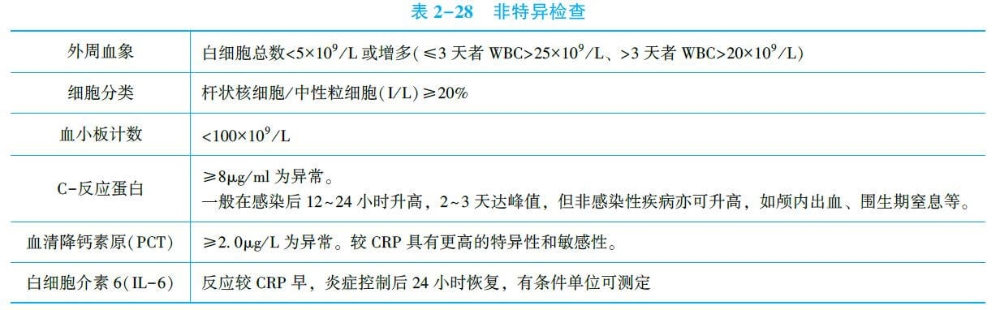 所謂非特異檢查指的是敏感性高而特異性差,即新生兒敗血癥時(shí)可出現(xiàn)以下指標(biāo)異常,但僅憑以下指標(biāo)異常不能確診新生兒敗血癥。