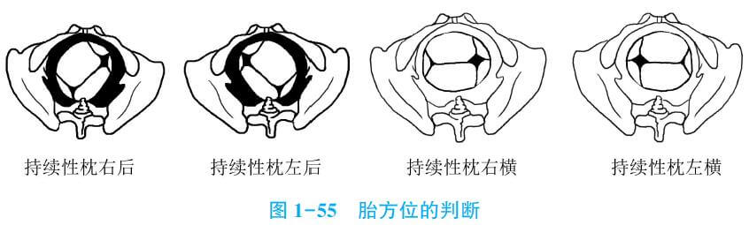 4.肛門檢查或陰道檢查 若胎頭矢狀縫位于骨盆左斜徑上,前囟在骨盆右前方,后囟(枕部)在骨盆左后方則為枕左后位,反之為枕右后位。查明胎頭矢狀縫位于骨盆橫徑上,后囟在骨盆左側(cè)方,則為枕左橫位,反之為枕右橫位。