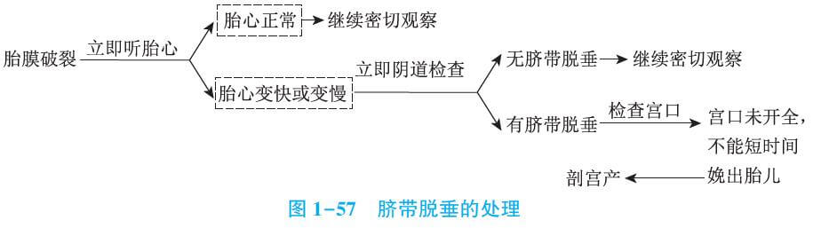 一旦破膜立即聽胎心。若胎心有異常應(yīng)立即陰道檢查,了解有無臍帶脫垂。若有臍帶脫垂,胎心尚好,宮口未開全,應(yīng)立即剖宮產(chǎn)。若無臍帶脫垂,可繼續(xù)嚴(yán)密觀察胎心及產(chǎn)程進(jìn)展。
