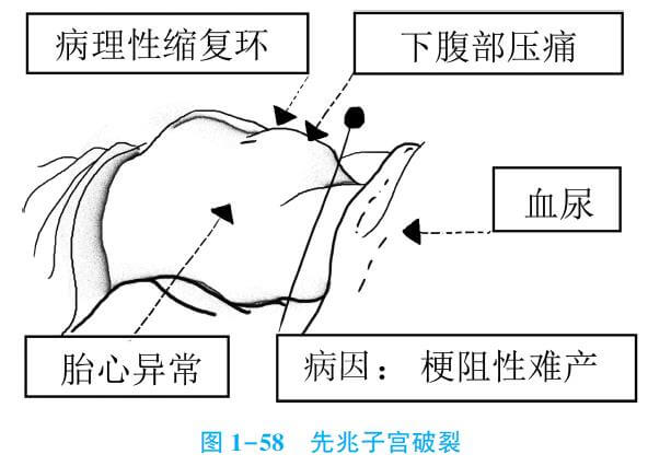見于產(chǎn)程長、有梗阻性難產(chǎn)因素的產(chǎn)婦。子宮病理縮復(fù)環(huán)形成、下腹部壓痛、胎心率異常和血尿,是先兆子宮破裂四大主要表現(xiàn)。