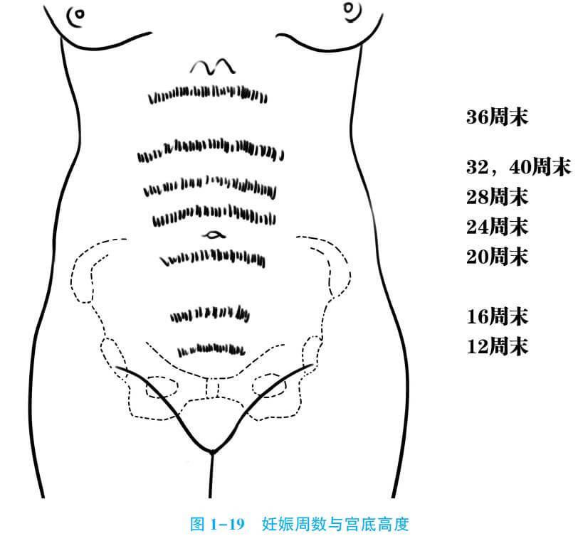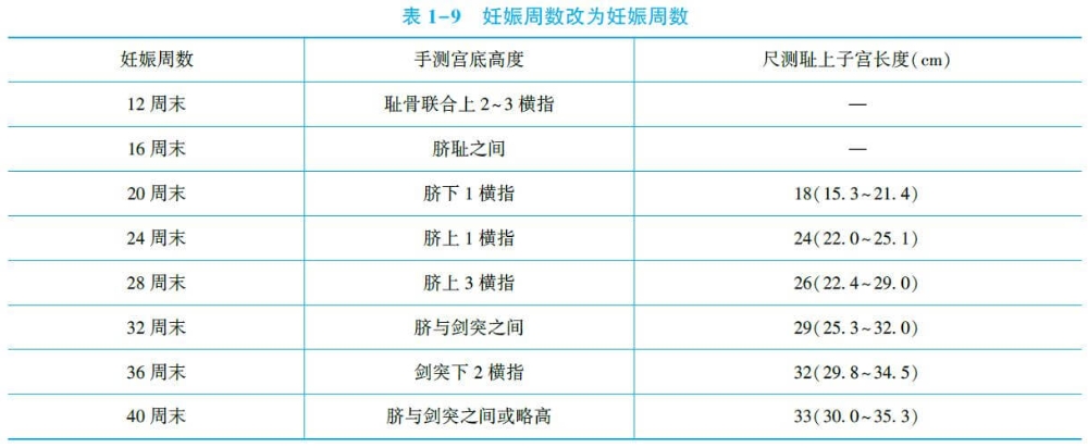 表1-9 不同妊娠周數(shù)的宮底高度及子宮長度