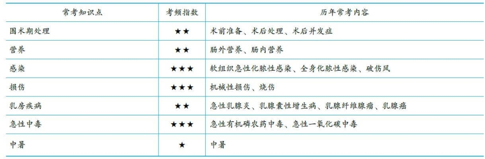 其他這部分內(nèi)容比較雜,但試題不難,核心考點(diǎn)比較明確。最容易命題、最該重點(diǎn)掌握的得分點(diǎn)包括——乳腺疾病、燒傷、外科感染、中毒、圍手術(shù)期處理。