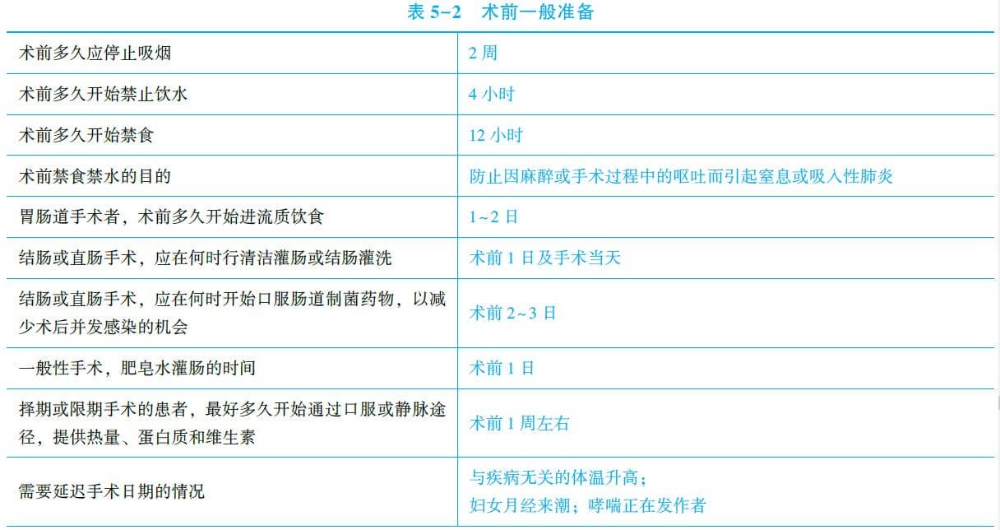 (5)輸血和補(bǔ)液:應(yīng)于術(shù)前糾正水、電解質(zhì)及酸堿平衡失調(diào)和貧血。需施行大、中手術(shù)者,術(shù)前應(yīng)做血型和交叉配合試驗(yàn),備血。
