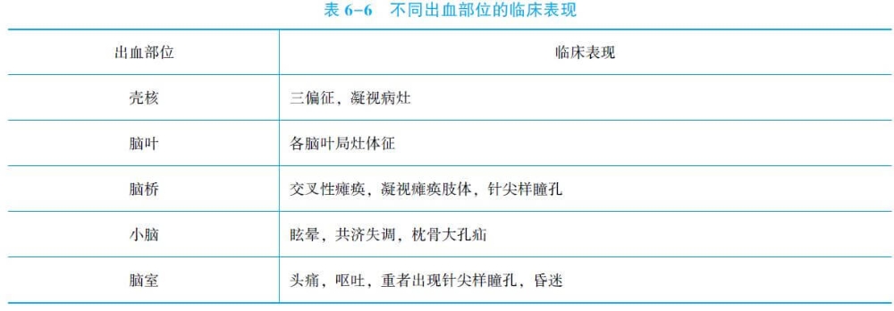 2.臨床表現(xiàn) 發(fā)病年齡常在50歲以上,多有高血壓病史,寒冷季節(jié)發(fā)病較多。多突然起病,起病前多無(wú)預(yù)感。多在白天起病,過(guò)勞、大便用力、興奮或激動(dòng)常為誘因。全腦癥狀為出血、水腫、高顱壓所致,表現(xiàn)為劇烈頭痛、嘔吐、意識(shí)障礙(嗜睡-昏迷)。局灶性癥狀表現(xiàn)為中樞性偏癱、面癱、舌癱、交叉癱、失語(yǔ)、感覺(jué)障礙等。不同部位的腦出血其臨床表現(xiàn)除上述的共同點(diǎn)外,各有其特點(diǎn):