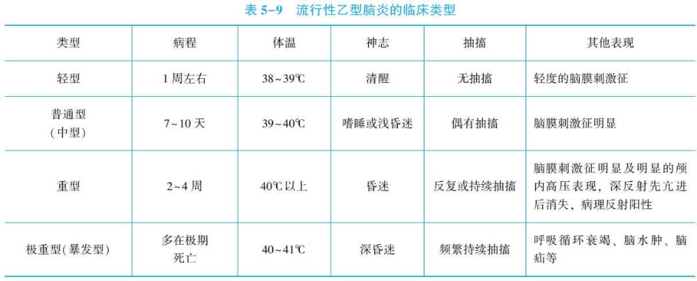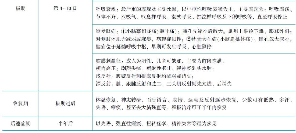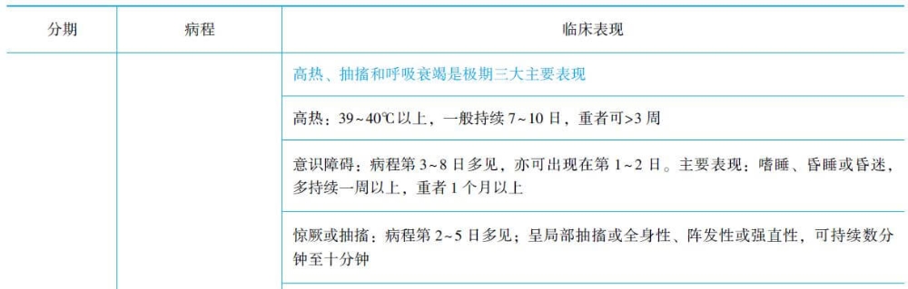 1.臨床分期及表現(xiàn) 典型的臨床經(jīng)過分四期,即初期、極期、恢復(fù)期和后遺癥期。