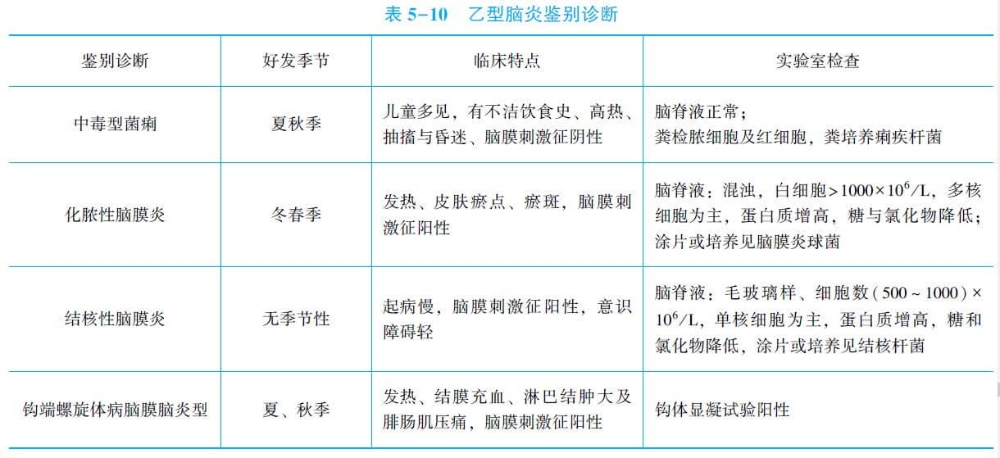 1.診斷 結(jié)合流行性乙型腦炎流行病學(xué)特點(多見于兒童、于夏秋季多見,以7、8、9月為高峰)+臨床表現(xiàn)(高熱、抽搐、呼吸衰竭及神經(jīng)系統(tǒng)表現(xiàn))+實驗室檢查(血白細(xì)胞、中性粒細(xì)胞及淋巴細(xì)胞增高、腦脊液壓力高及血清特異抗體IgM抗體陽性)可確診。