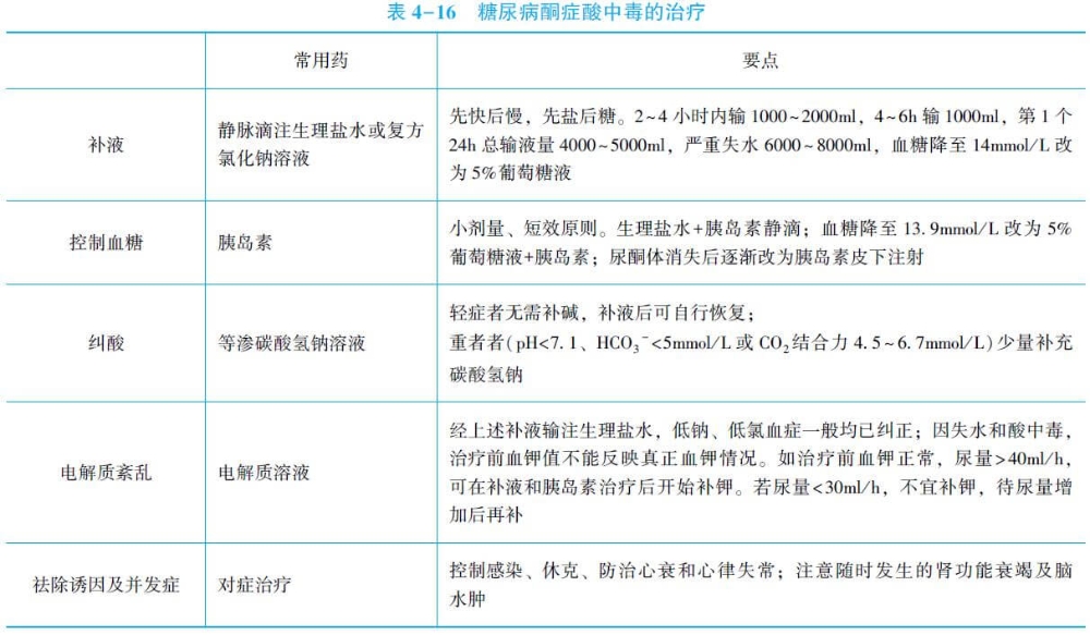 (4)治療:單純酮癥根據(jù)血糖、尿糖調(diào)整胰島素劑量,給予輸液至酮癥消失。對糖尿病酮癥酸中毒應立即搶救。
