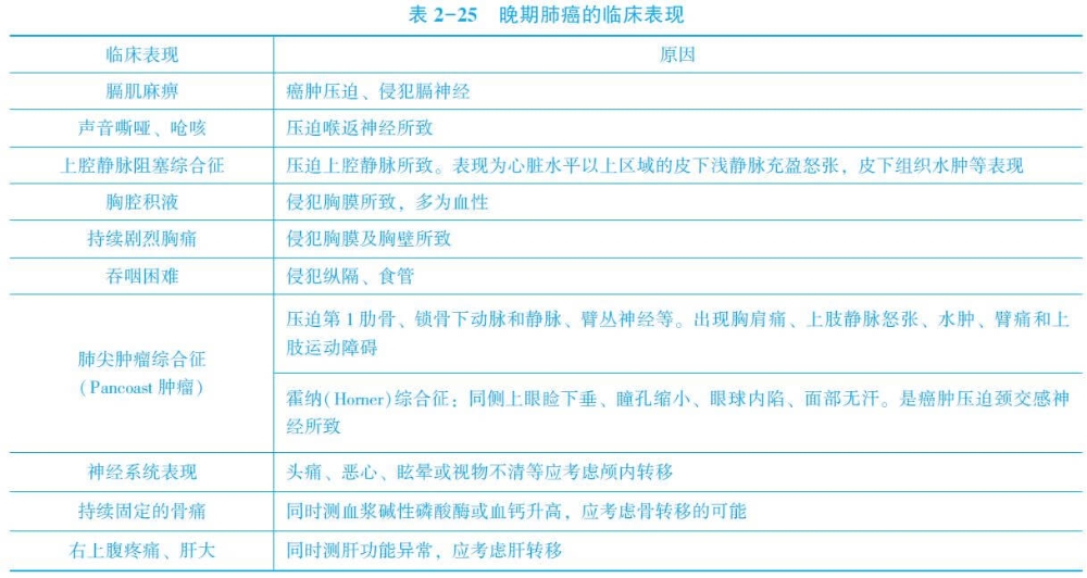 2.晚期肺癌 主要為癌腫占位、壓迫或遠(yuǎn)處轉(zhuǎn)移的表現(xiàn)。