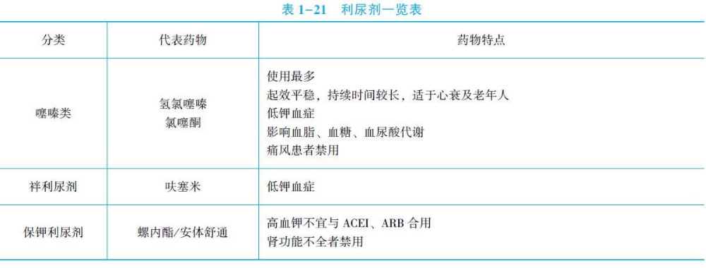 (3)分類特點:有噻嗪類、袢利尿劑和保鉀利尿劑三類。①噻嗪類:應(yīng)用最普遍,但長期應(yīng)用可引起血鉀降低及血糖、血尿酸、血膽固醇增高,糖尿病及高脂血癥患者宜慎用,痛風(fēng)患者禁用;②保鉀利尿劑:可引起高血鉀,不宜與ACEI合用,腎功能不全者禁用;③袢利尿劑:利尿迅速,腎功能不全者應(yīng)用較多,但過度作用可致低血鉀、低血壓。