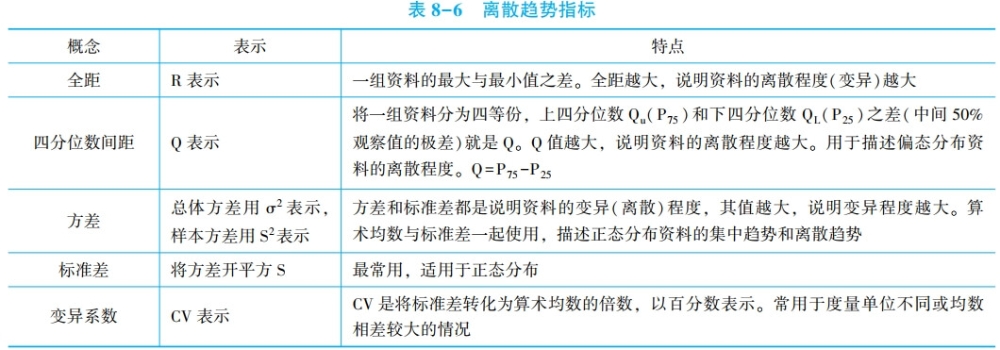 反映一組同質(zhì)觀察值的變異程度。常用的描述變異程度的統(tǒng)計(jì)指標(biāo)包括極差、四分位數(shù)間距、方差、標(biāo)準(zhǔn)差和變異系數(shù)。